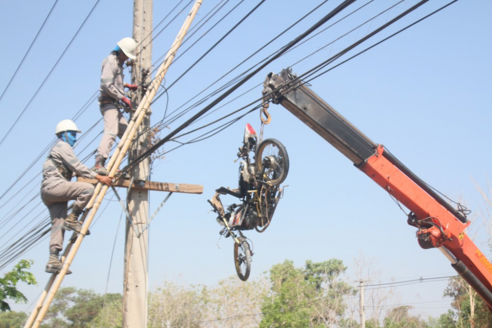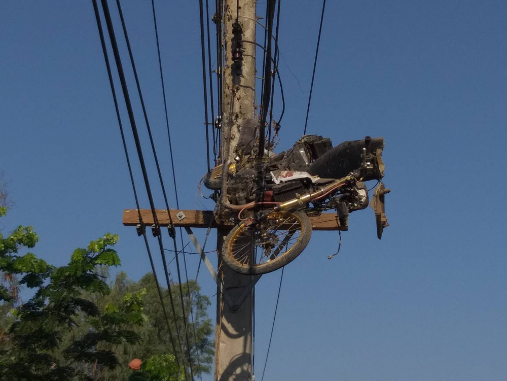 Một chiếc xe máy đã bị mắc kẹt trên một cột điện cao 4 mét sau một tai nạn tại tỉnh Surin Thái Lan vào tối cuối tuần trước.