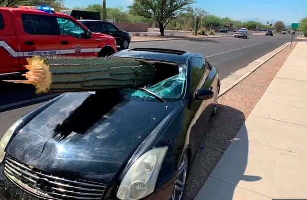Thân cây dày, gai của một cây xương rồng Saguaro có thể được nhìn thấy nhô ra trên nắp ca-pô. Các bức ảnh khác chụp bên cạnh xe cho thấy cái cây nằm giữa ghế lái và ghế hành khách ở phía trước.