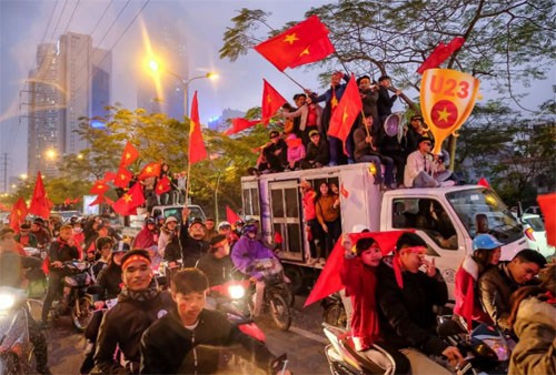 Người hâm mộ bóng đá Việt Nam đổ ra đường phố chào mừng tuyển U23 về nước vào ngày 28/1. Ảnh: Linh Pham.