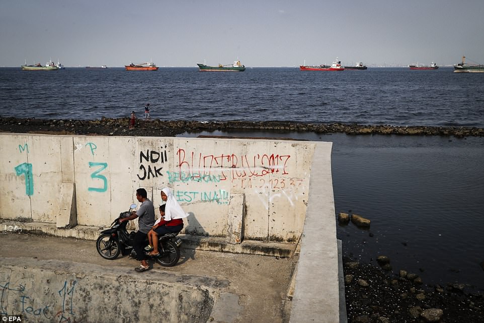 Một gia đình đang đi xe máy dọc theo bức tường biển trong khu vực Muara Baru, nơi đang đi đầu trong việc chống lũ lụt ở Jakarta.