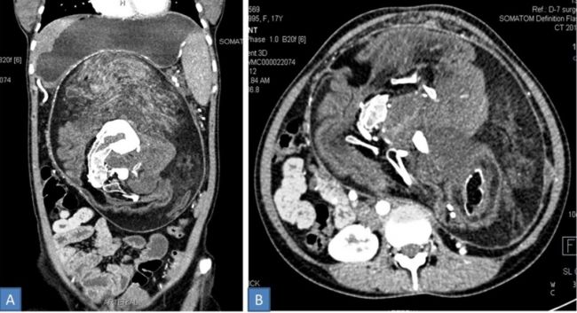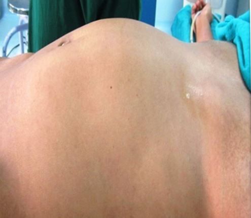 Theo báo cáo công bố trên tạp chí BMJ Case Reports, thiếu nữ 17 tuổi đã phát hiện bụng mình có khối u kỳ lạ từ 5 năm trước. Song, đến khi nhận thấy bụng bắt đầu phình to, cô mới hốt hoảng đến gặp bác sĩ. Cô gái trẻ thường xuyên thấy căng tức bụng và đau đớn dù chẳng ăn uống gì nhiều.