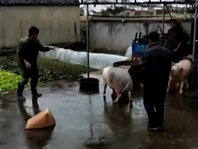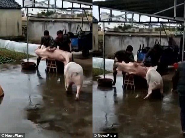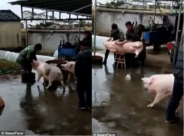 Theo đó, chú lợn đã lao tới tấn công hai người đàn ông một cách hung hãn khi họ đang “đè” một con lợn khác trên bàn mổ. Con lợn vội vã chạy đến, húc mõm vào từng người. Quá sợ hãi trước hành động của chú lợn, hai người đàn ông đã phải thả “người bạn” của nó ra.