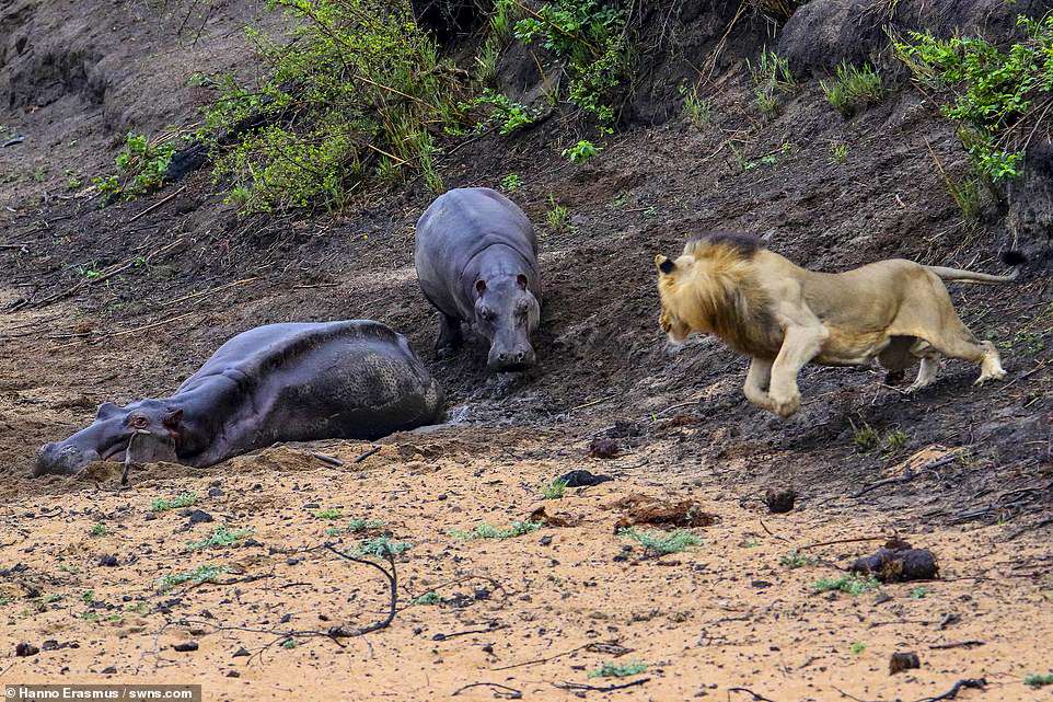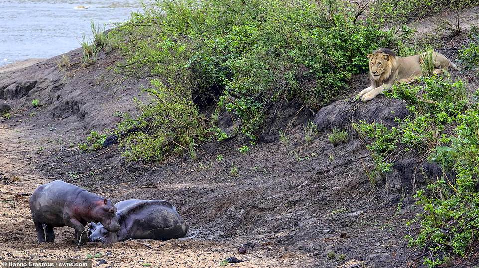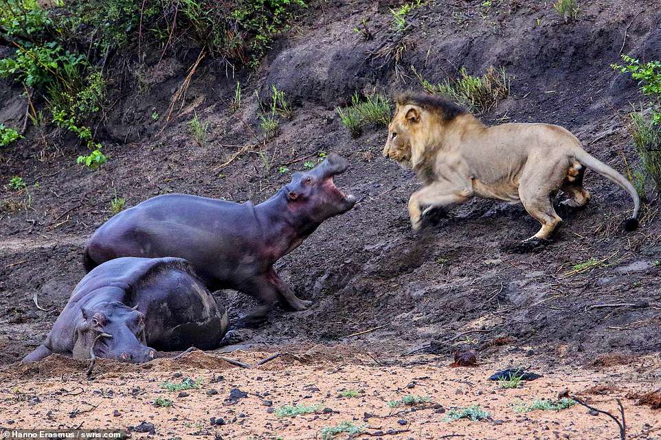 Nhưng dù nhiều lần tìm cách tấn công hà mã mẹ, sư tử đều bị hà mã con xua đuổi.