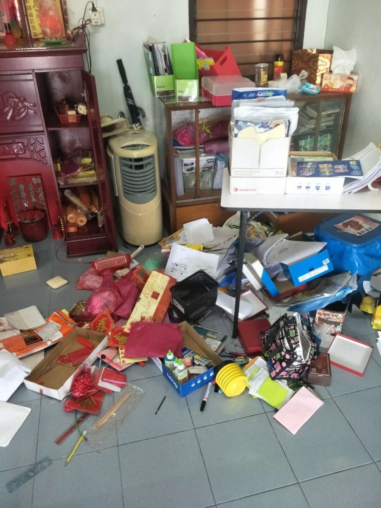 Mọi ngóc ngách trong căn nhà nhỏ, từ phòng khách cho tới phòng ngủ, các đồ vật đều bày bừa rất lộn xộn, vương vãi khắp nơi và trông không khác gì như vừa có cơn lốc xoáy quét qua ngôi nhà. Theo Sin Chew, tình trạng ngôi nhà bừa bộn tới nỗi khiến 2 tên trộm vô cùng sốc, thậm chí một trong số chúng còn hỏi trực tiếp chủ nhà rằng: “Đây có phải là nhà của ông không?” khi gặp chủ nhà ngay trước cửa.