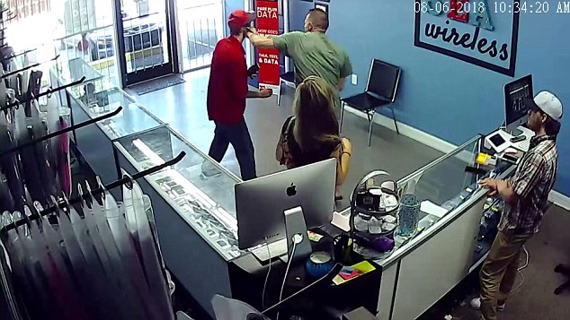 Cảnh tượng gây sốc này được ghi lại tại một cửa hàng điện thoại ở Lincolnton, phía Bắc Carolina, Mỹ vào ngày 8/8. Theo đó, một cặp đôi ghé thăm cửa hàng này để mua điện thoại. Trong lúc họ đang nói chuyện với người bán hàng thì người đàn ông thấy một chàng trai lạ, mặc áo phông màu đỏ đang nhìn chằm chằm vào mông của bạn gái mình và cười nhếch mép.