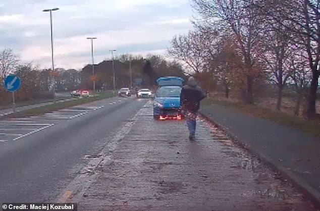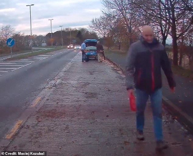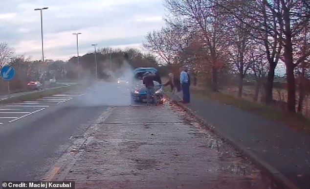Maciej Kozubal năm nay 42 tuổi, là một công nhân tại Barnsley (Anh). Lúc 15h40 ngày 18/11, ông bố 3 con đang lái xe qua đường Denby Dale ở Wakefield thì trông thấy một chiếc ô tô màu xanh đỗ bên lề. Thoạt nhìn chiếc xe chẳng có gì bất thường, anh định nhấn ga đi tiếp thì chợt dừng lại khi phát hiện chiếc xe bắt đầu bén lửa từ thanh cản phía dưới.