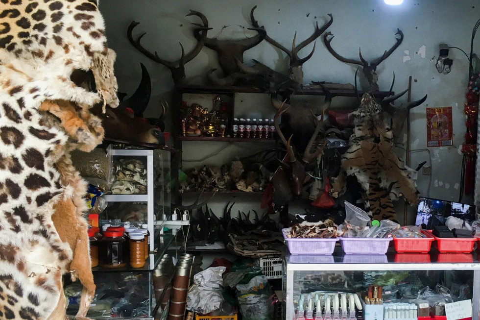 Da báo và hổ được chất đống trong các cửa hiệu ven đường, ngoài ra còn có ngà voi, vảy tê tê và nhiều loài chim quý hiếm.