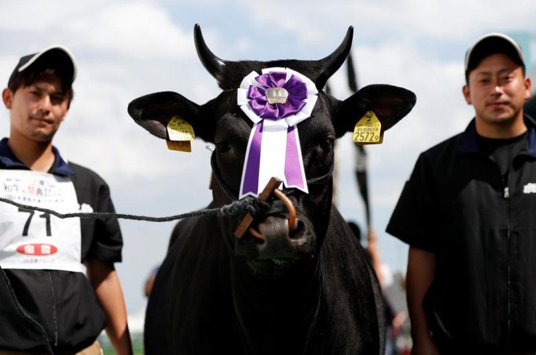 Cô bò Yoriko 18 tháng tuổi, đến từ quận Kagoshima, được chụp ảnh sau khi đăng quang tại Triển lãm Năng suất Bò Nhật Bản lần thứ 11, thường được gọi là Thế vận hội Wagyu, tại Sendai.