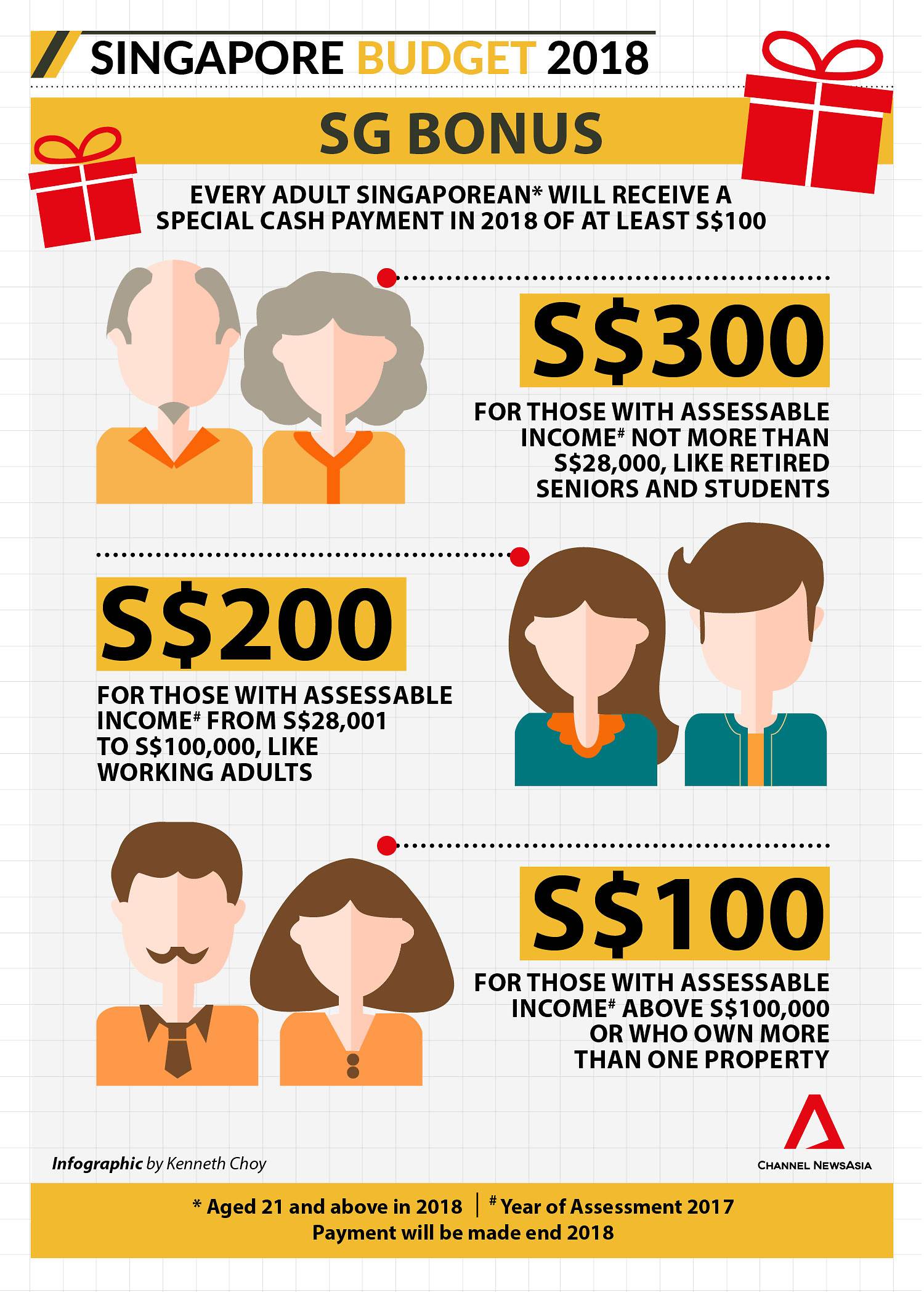 Các khoản tiền tặng thêm hay còn gọi là SG Bonus sẽ được chuyển tới khoảng 2,7 triệu người dân vào cuối năm 2018. Tổng số tiền chính phủ Singapore dự kiến chia cho người dân là 700 triệu SGD (532 triệu USD).