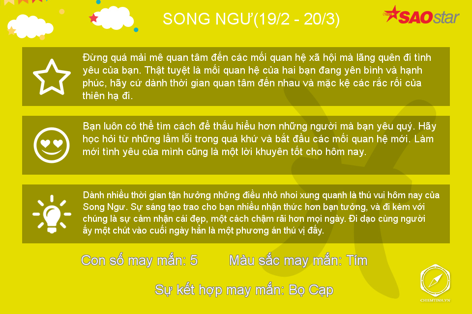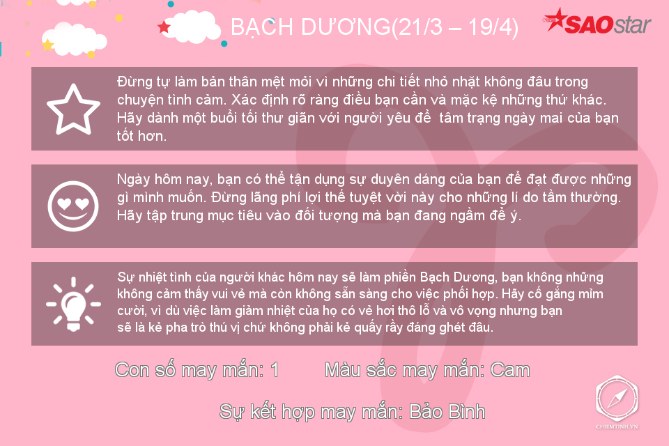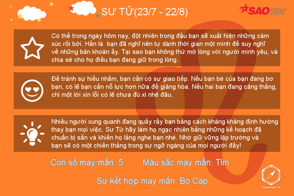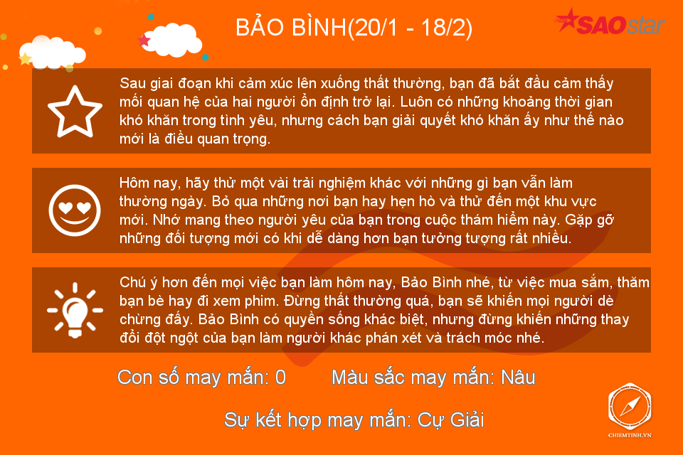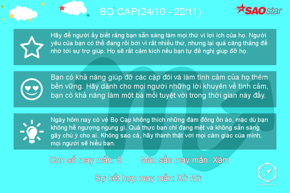 Hôm nay có vẻ Bọ Cạp không thích đám đông ồn ào nhưng nếu có thể, hãy dành những lời khuyên về tình cảm cho mọi người vì bạn đang có khả năng làm một “bà mối” tuyệt vời trong thời gian này đấy.
