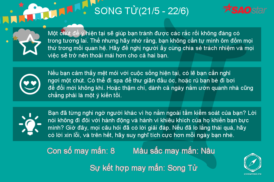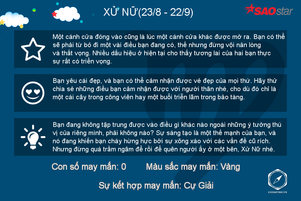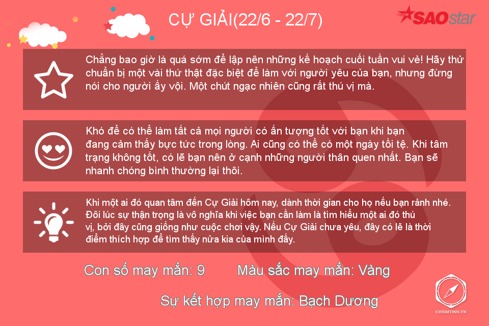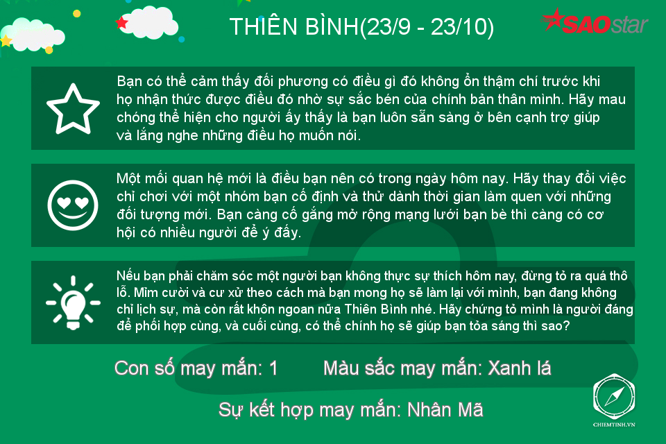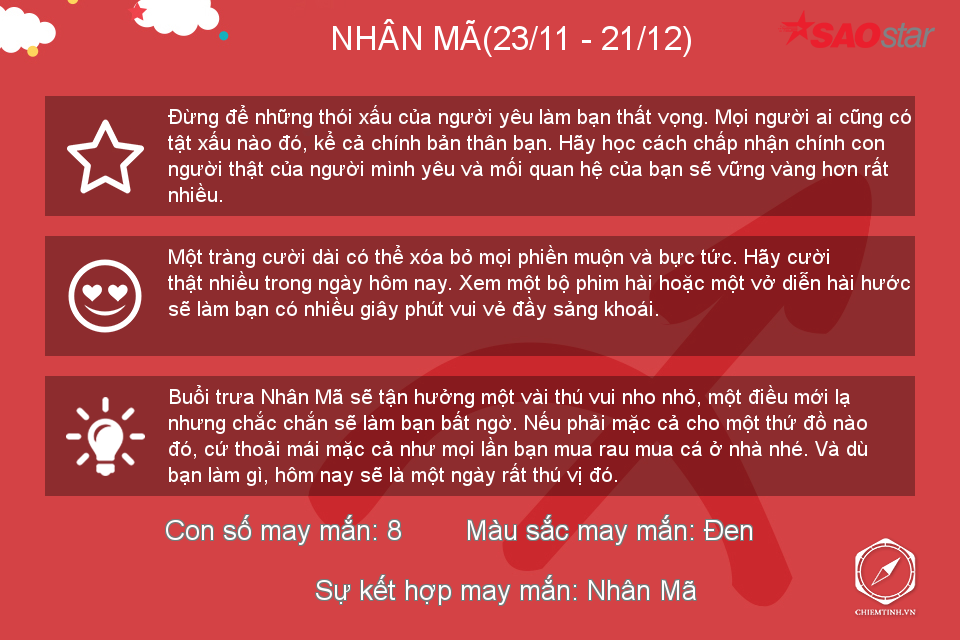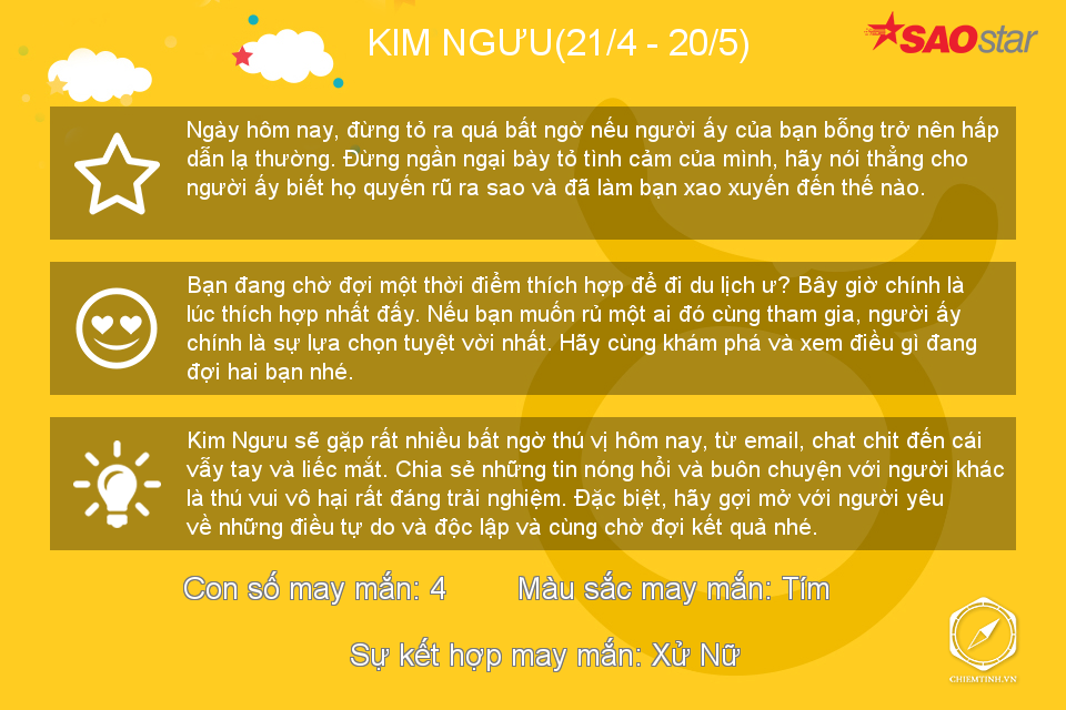 Hôm nay có vẻ Bọ Cạp không thích đám đông ồn ào nhưng nếu có thể, hãy dành những lời khuyên về tình cảm cho mọi người vì bạn đang có khả năng làm một “bà mối” tuyệt vời trong thời gian này đấy.