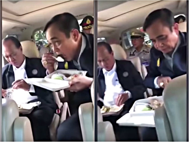 Thủ tướng Thái Lan Prayut Chan-ocha (bên phải) đang tranh thủ ăn cơm hộp trên xe.
