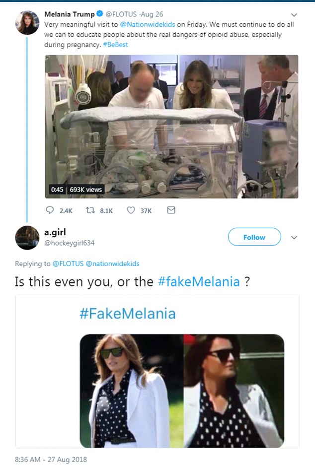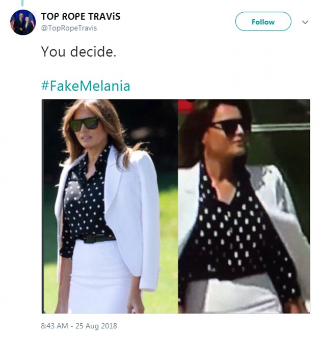 Người dùng Twitter tin rằng bà Melania đã sử dụng người đóng thế mình để xuất hiện trước công chúng và không hài lòng với diện mạo của bà Melania giả mạo.