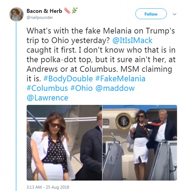 Một người dùng đã viết: “Có chuyện gì với bà Melania giả mạo trong chuyến thăm của ông Trump tới Ohio ngày hôm qua vậy? @ItIsIMac đã phát hiện ra đầu tiên. Tôi không biết đó là ai nhưng chắc chắn người phụ nữ xuất hiện ở Andrews hay Columbus không phải là bà ấy”.