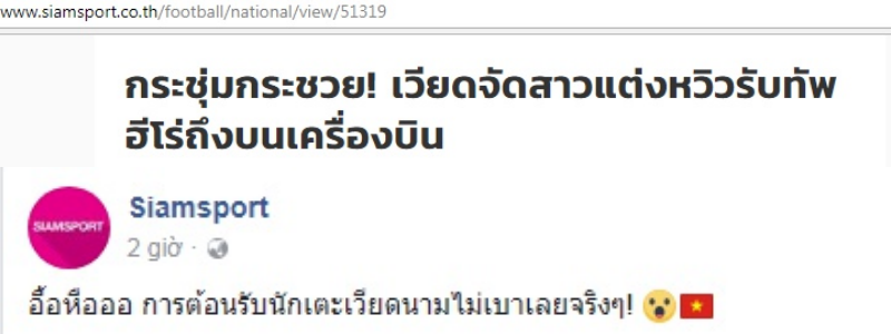 Tờ Siamsport đưa tin: “Trong không khí đội tuyển U23 Việt Nam trở về quê nhà sau giải đấu U23 Châu Á, người dân và quan chức chính phủ đã tới đón những ngôi sao vàng của đất nước.