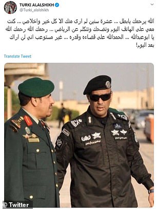 Cố vấn Tòa án Hoàng gia Turki al-Sheikh đã tweet: “Cách đây không lâu, chúng ta còn vui vẻ chuyện trò với nhau qua điện thoại về Riyadh … Chúa trời phù hộ cho anh. Thật không thể tin chúng ta đã là người của hai thế giới!”.
