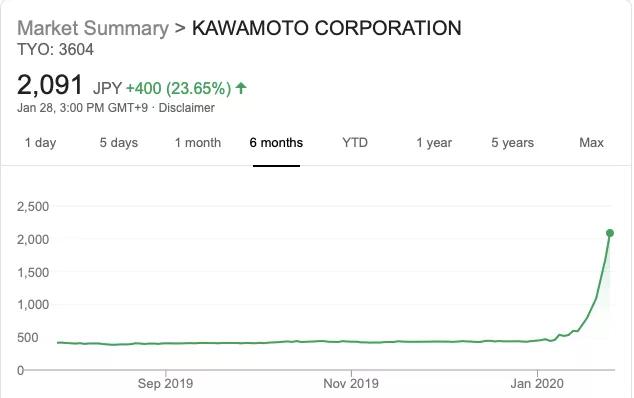 Theo truyền thông đưa tin, sau khi chính thức xác nhận có những trường hợp đầu tiên tại Nhật Bản bị nhiễm Corona, giá cổ phiếu của một số thương hiệu sản xuất khẩu trang lập tức có chiều hướng tăng vọt. Các trang thương mại mua bán xuyên quốc gia cho biết các đơn đặt hàng từ thương nhân Trung Quốc tại thời điểm này cũng tăng gấp 5 lần.