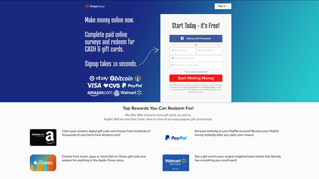 PrizeRebel sẽ giúp bạn kiếm tiền bằng cách làm các phiếu điều tra, xem video và hoàn thành một số việc được giao. Bạn còn có thể quy đổi điểm thành Bitcoins và card quà tặng hoặc rút tiền qua Paypal khi sử dụng trang web này.