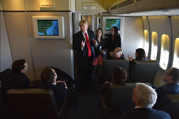 Trong mỗi chuyến bay của tổng thống Mỹ thường có sự đồng hành của Phu nhân Melania Trump. Hai người có thể tới khu vực dành cho báo chí để trò chuyện và trả lời phỏng vấn.