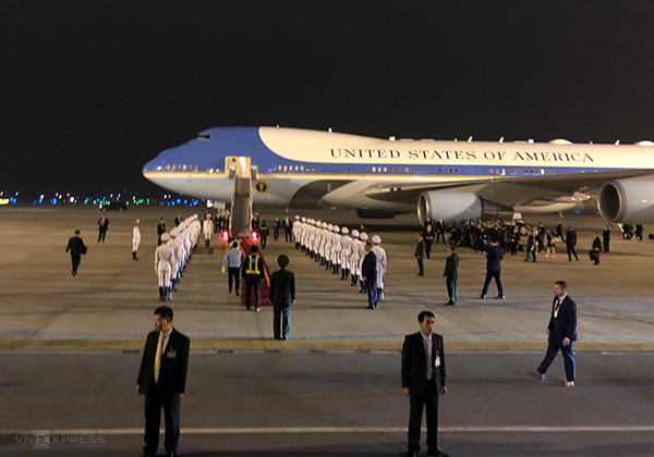 Chuyên cơ chở Tổng thống Mỹ đáp xuống sân bay quốc tế Nội Bài lúc 21h. Nhiều quan chức Việt Nam và phái đoàn Mỹ có mặt ở chân máy bay đón Tổng thống Trump.