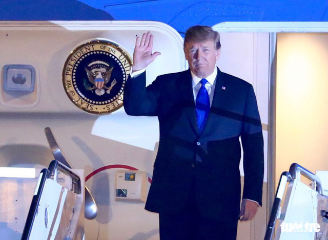 Tổng thống Donald Trump bước ra khỏi máy bay, vẫy chào mọi người. Ảnh: NGUYỄN KHÁNH/Tuổi Trẻ