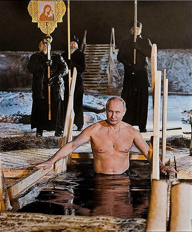 Hình ảnh Tổng thống Putin cởi trần ngâm mình dưới nước lạnh khoảng - 6 độ C để cử hành nghi lễ rửa tội của các tín đồ Chính thống giáo trong bộ lịch năm 2019.