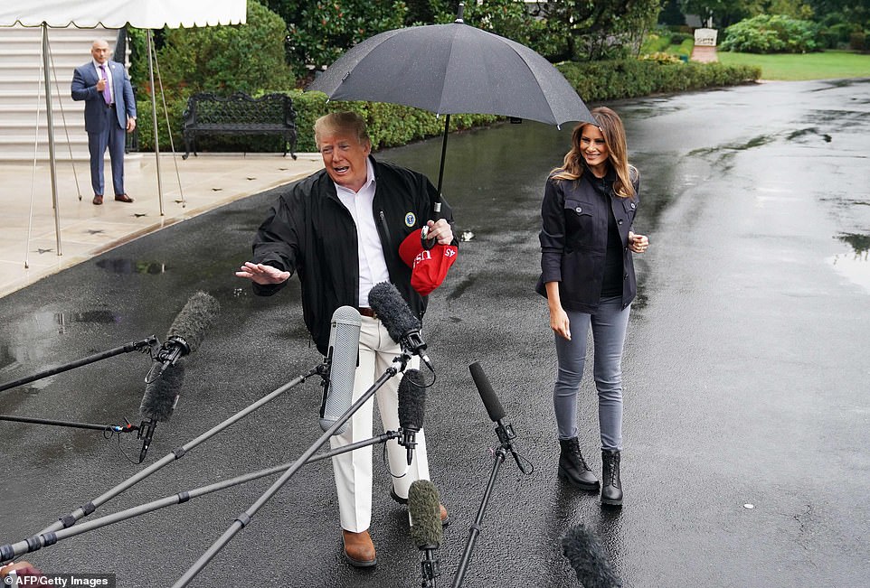 Trump bỏ mặc vợ đứng dưới mưa để trò chuyện với phóng viên.