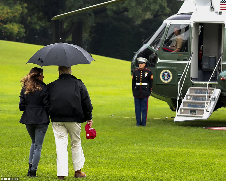 Hai người sau đó di chuyển tới trực thăng Marine One nhưng ông Trump vẫn chỉ che ô cho mình ông, dường như không để ý đến bà Melania đang bị ướt. Mãi cho tới lúc gần lên tới chuyên cơ, ông Trump dường như mới nhớ tới bà Melania mà đổi tay cầm ô để che mưa cho vợ.