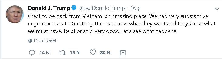 Trên Twitter cá nhân ngày 1/3, Tổng thống Trump viết: “Thật tuyệt khi trở về từ Việt Nam, một đất nước tuyệt vời. Chúng tôi đã có các cuộc đàm phán ý nghĩa với ông Kim Jong-un - chúng tôi biết họ muốn gì và họ biết chúng tôi phải có gì. Mối quan hệ rất tốt đẹp, hãy chờ xem điều gì sẽ xảy ra”.