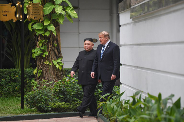 Chủ tịch Kim Jong-un và Tổng thống Donald Trump đã có cuộc họp kín 15 phút, ngắn so với kế hoạch 45 phút. Sau đó, hai ông đi dạo cùng nhau trong khuôn viên khách sạn Metropole. Ảnh: AFP