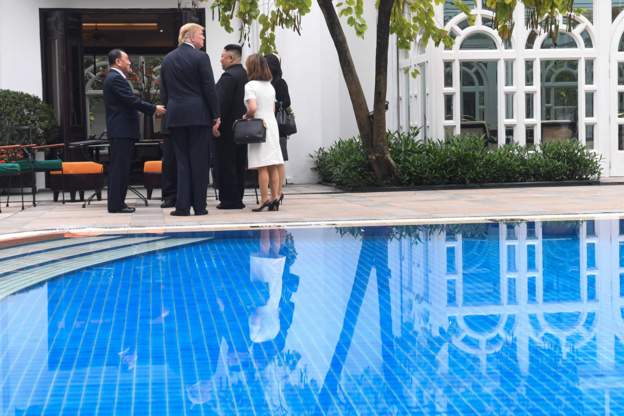 Tổng thống Trump và Chủ tịch Kim theo lịch trình sẽ có một cuộc trò chuyện bên bể bơi tại khách sạn Metropole nhưng kế hoạch dường như đã thay đổi vào phút chót vì lý do thời tiết. Sau khi trò chuyện vài phút qua hai phiên dịch viên, hai nhà lãnh đạo đi vào trong để bắt đầu phiên họp với các cố vấn. Phiên họp mở rộng dự kiến kéo dài tới 11h55. Một lễ ký thỏa thuận chung sẽ diễn ra lúc 14h05 và đến 15h05, Tổng thống Trump sẽ tổ chức một cuộc họp báo trước khi lên chuyên cơ về Mỹ. Ảnh: AFP