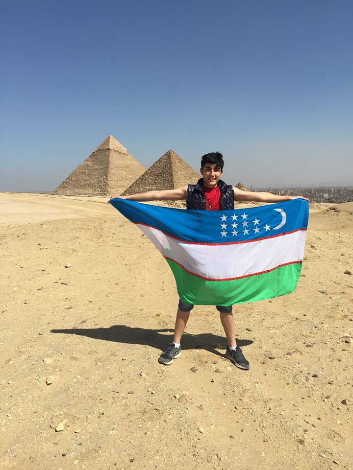 Azizov cầm quốc kỳ của Uzbekistan khi tới thăm Ai Cập.