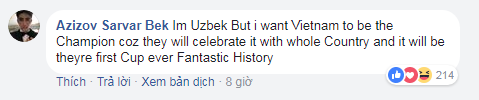 Trên trang facebook Asian Football Confederation, chàng trai có nickname Azizov Sarvar Bek, đến từ Uzbekistan, viết: “Tôi là người Uzbekistan nhưng tôi muốn Việt Nam giành chức vô địch vì như vậy, cả nước sẽ ăn mừng chiến thắng và đó sẽ là chiến thắng tuyệt vời đầu tiên trong lịch sử bóng đá Việt Nam”.
