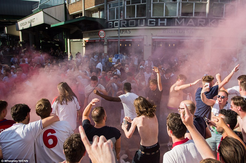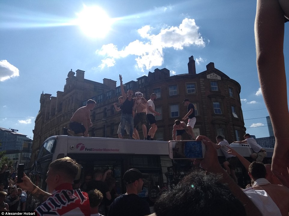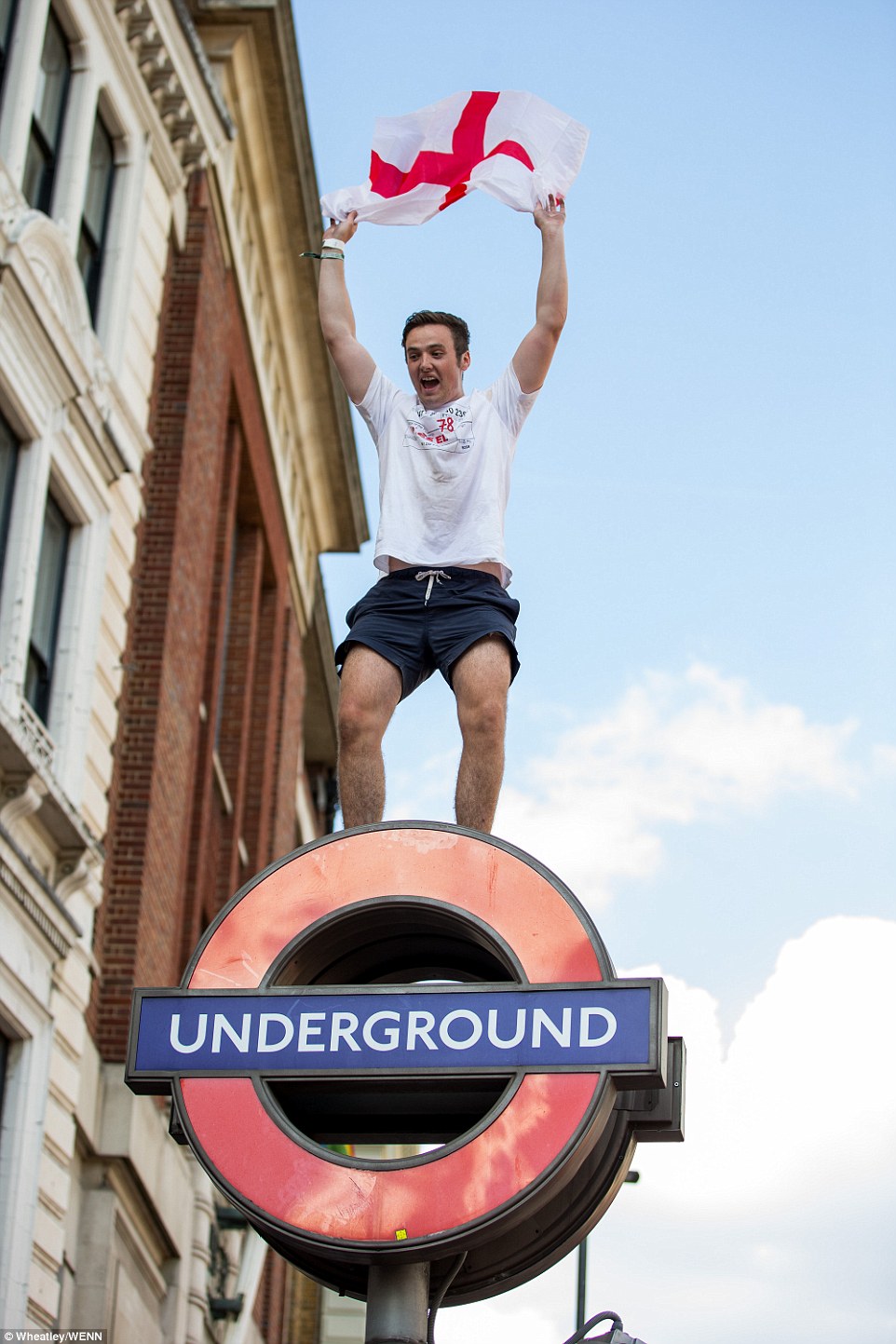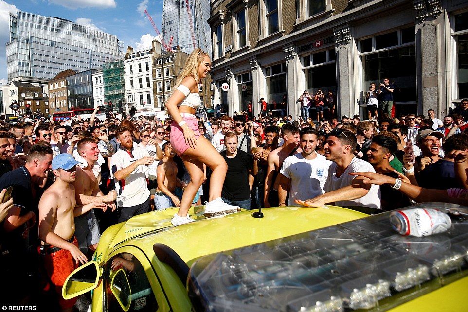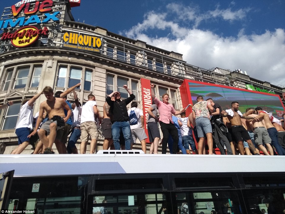 Trong khi đó nhiều CĐV khác vừa nhảy vừa hát theo bài Three Lions trên nóc xe buýt. Một người đàn ông ở Clapham Junction, London, đã không kiềm chế được bản thân, nhảy từ nóc xe buýt xuống mái nhà chờ xe buýt và đâm thẳng vào những tấm kính.