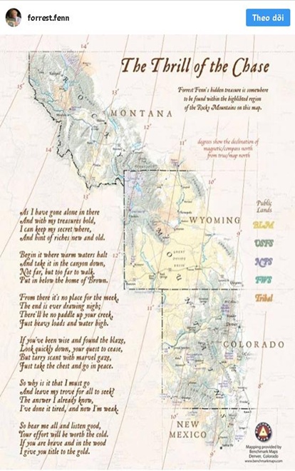 Ông Finn gợi ý mọi người về nơi cất giấu kho báu bằng tấm bản đồ và bài thơ gồm 24 dòng chứa 9 manh mối. Ảnh: Instagram