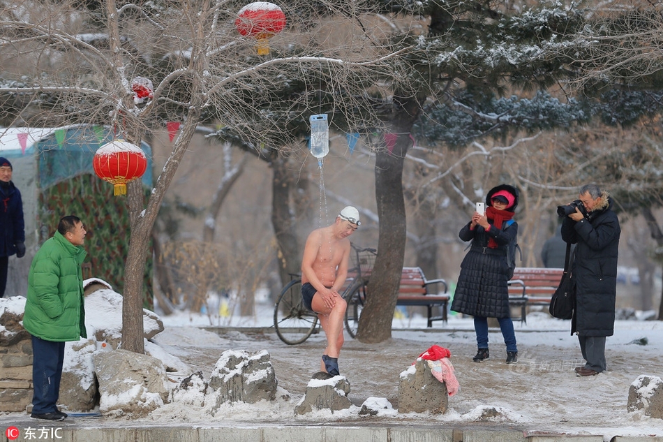 Nhiệt độ ngoài trời tại Trung Quốc đang xuống thấp, trời lạnh thấu xương nhưng điều đó không thể ngăn cản niềm đam mê bơi lội của họ.