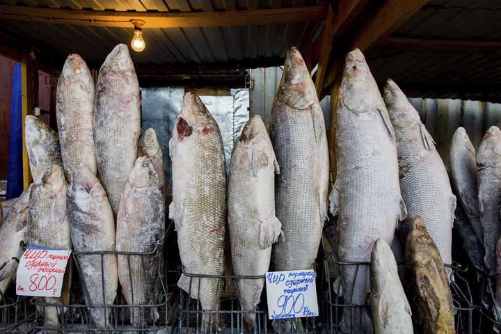 Nhiều du khách khi tới đây cũng thường ghé qua chợ cá, nơi họ có thể chiêm ngưỡng những con cá bị đóng băng mà không cần cho vào tủ đá hay ướp lạnh. Trong thời tiết dưới -60 độ C như thế này, những con cá cũng tự “hóa đá” luôn.