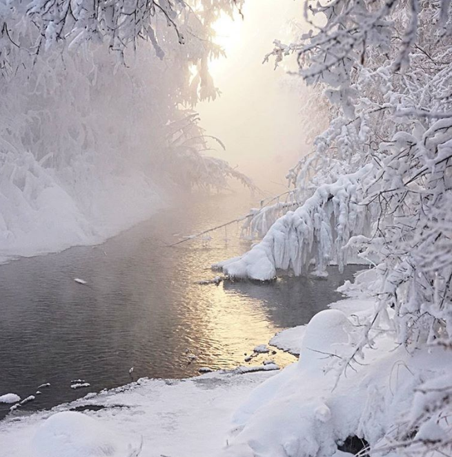 Tuyết phủ trắng ở khắp nơi, từ cành cây lên mặt sông.