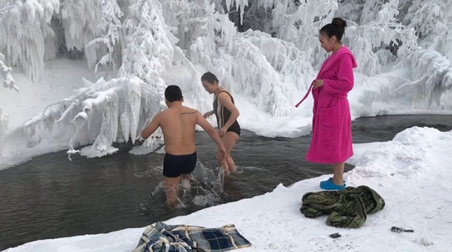 Trong khi người dân địa phương tại làng Oymyakon ở Yakutia, Nga - nơi được mệnh danh là ngôi làng lạnh nhất thế giới - đang oằn mình chống lại cái lạnh cắt da cắt thịt thì một nhóm du khách Trung Quốc vẫn thản nhiên trút bỏ quần áo, xuống hồ bơi lội, hò hét vui vẻ.