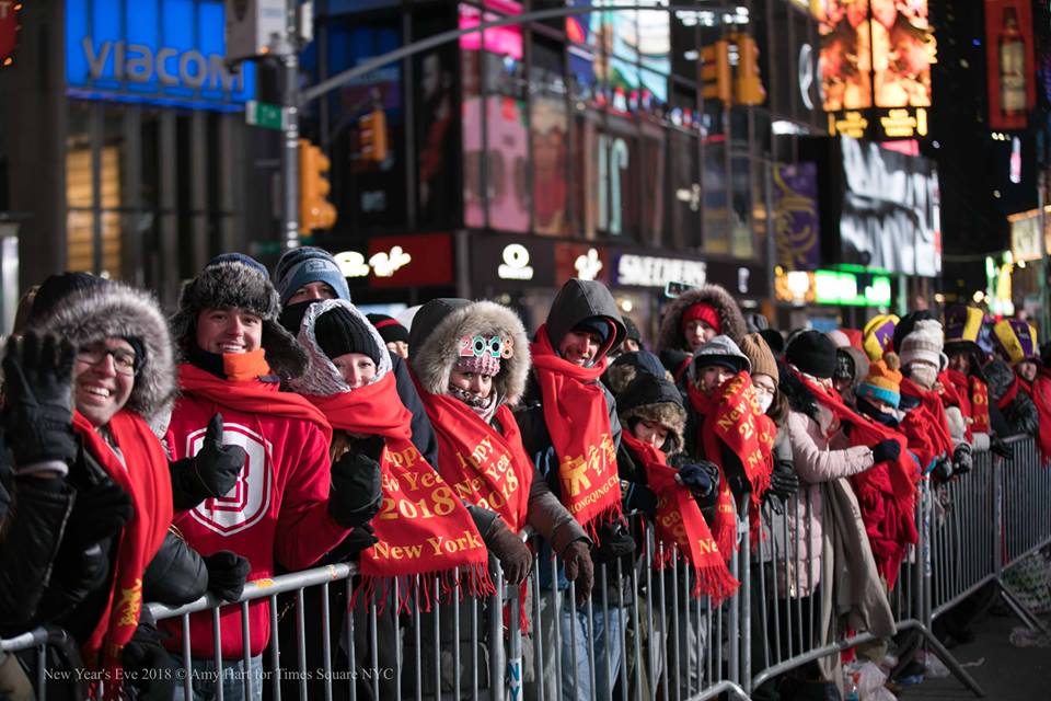 Dòng người xếp hàng dài chờ đợi đồng hồ tại Quảng trường Thời đại tại New York điểm 0h. Khoảnh khắc được trông đợi nhất là khi quả cầu pha lê được thả vào đêm giao thừa, đánh dấu năm 2018 đã đến. Năm nay, cầu pha lê có đường kính 3,5 m, nặng 5,385 tấn, được bao phủ bởi 2.688 mảnh tam giác có thể thay đổi màu sắc và được chiếu sáng bằng 32.256 bóng đèn LED.