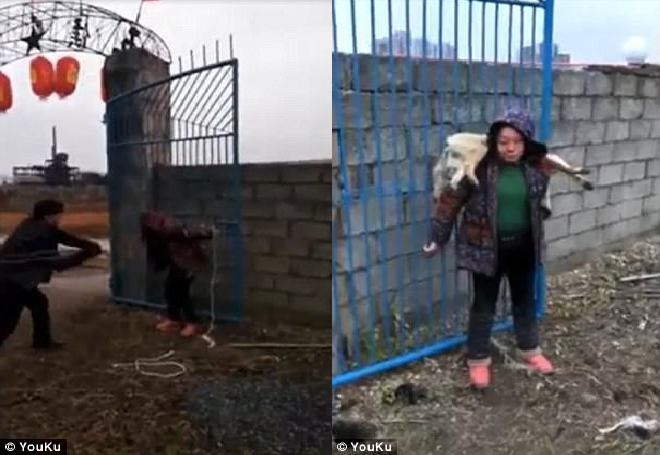 Người phụ nữ Trung Quốc bị dân làng trói vào cổng và đánh đập dã man sau khi họ phát hiện cô cố tình trộm chó bằng cách phi tiêu độc. Người dân cho biết cô ta định giết chó, sau đó bán con vật cho các cửa hàng nhưng không may bị bắt ngay tại trận.