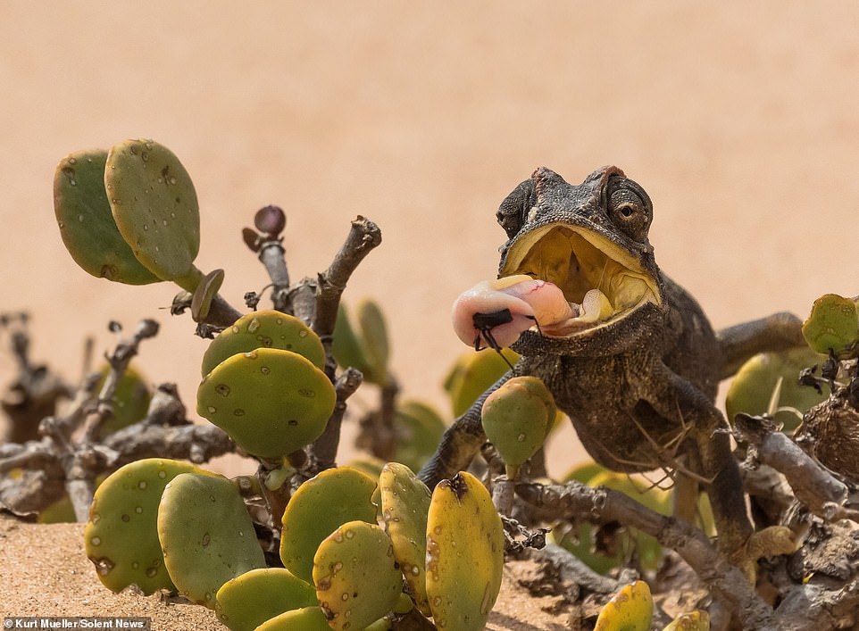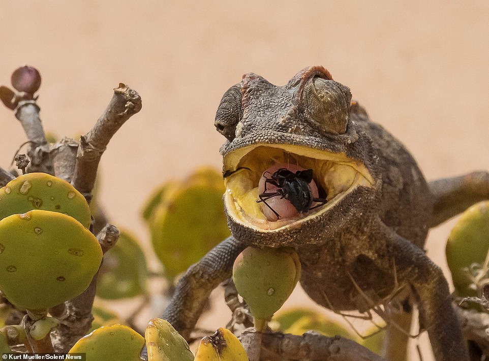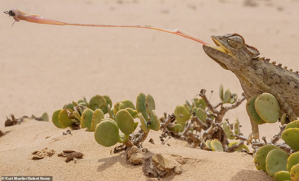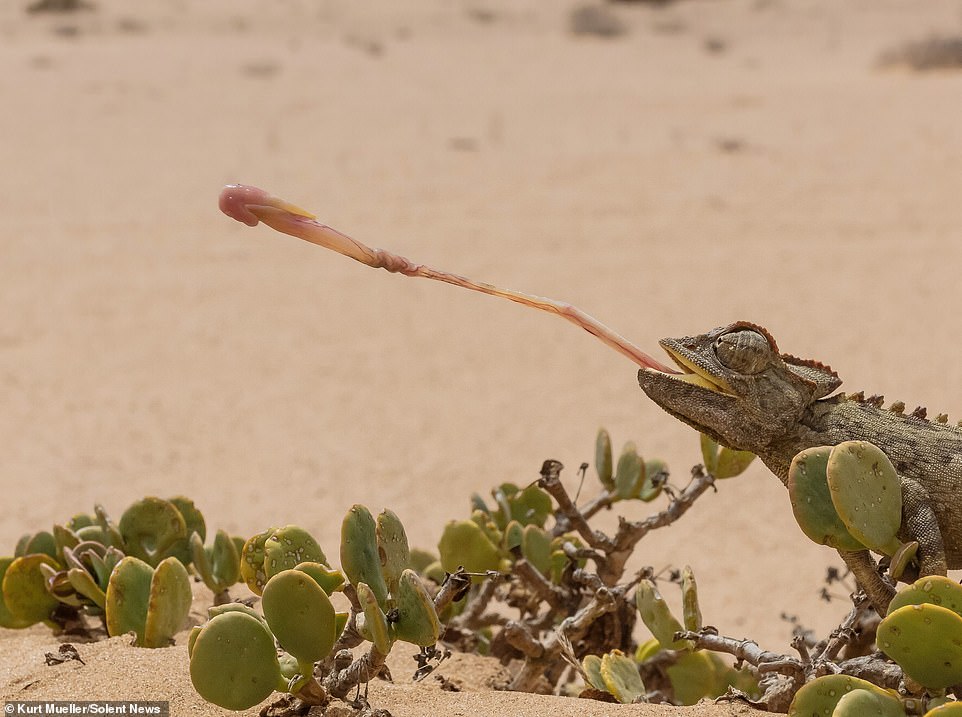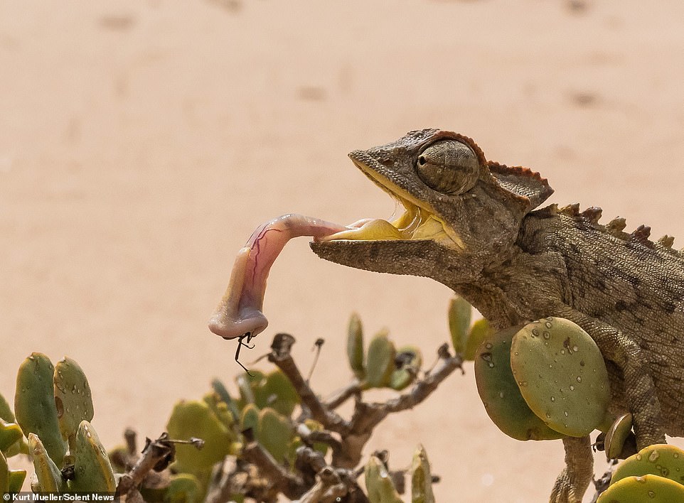 Theo đó, con tắc kè hoa xanh này thuộc giống Namaqua, được chụp tại sa mạc Namib, miền Nam châu Phi. Sau khi phát hiện một con ruồi bay ngang, không do dự, nó nhanh chóng thè lưỡi bắt con ruồi xấu số - khoảnh khắc chỉ diễn ra trong tích tắc.