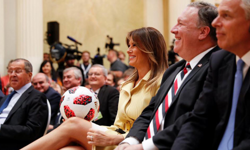 Đệ nhất phu nhân Mỹ Melania Trump mỉm cười cầm quả bóng trong cuộc họp báo tại Helsinki, Phần Lan hôm 16/7. Ảnh: Reuters.