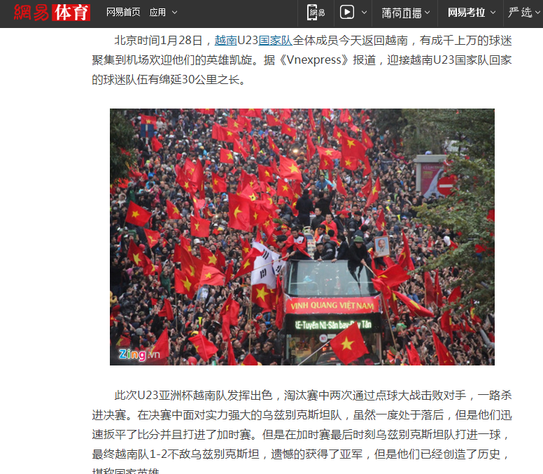 Bài viết trên trang Wang Yi của Trung Quốc có nội dung: “Sắc đỏ của người hâm mộ, bao gồm cả người già và trẻ nhỏ, tràn ngập trên quãng đường 30km mà các cầu thủ trở về. Màu sắc ấy đã khiến đội tuyển U23 thêm một lần nữa sống trong sự hạnh phúc. Trước đó, họ đã có những trận đấu tuyệt vời tại mùa giải. Đáng tiếc chỉ giành vị trí á quân, nhưng họ đã tạo ra lịch sử và được người dân Việt Nam ca ngợi như những người anh hùng dân tộc”.