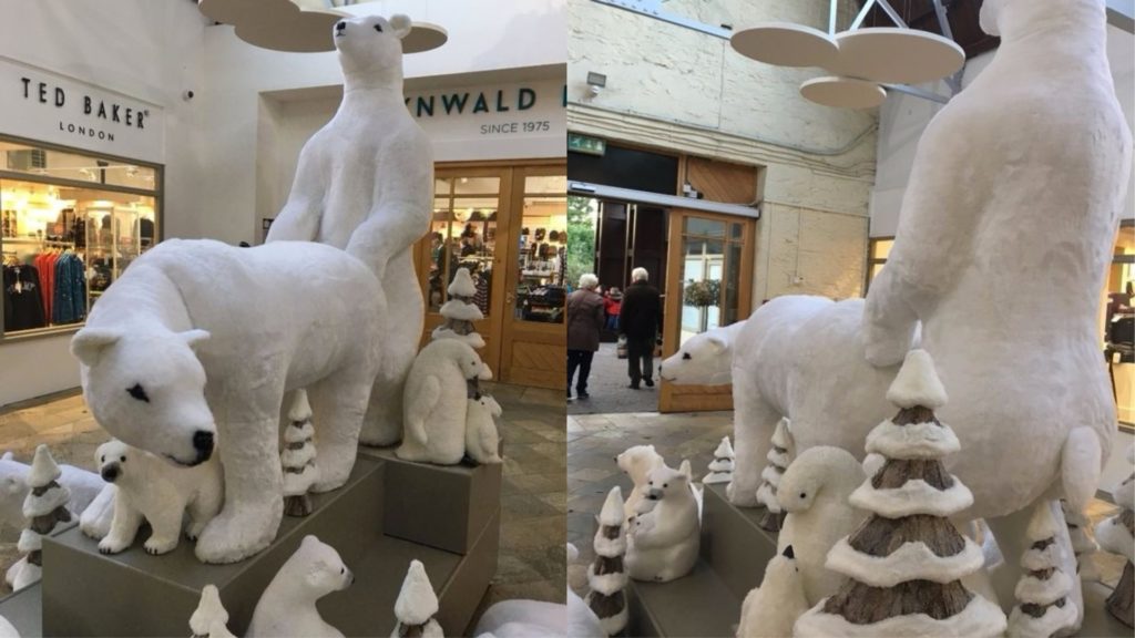 Tuần qua, người ta trang trí trước sảnh của trung tâm mua sắm Tynwald Mills ở Đảo Man tượng một gia đình gấu Bắc Cực. Tạo hình của gấu bố và gấu mẹ khiến nhiều người chú ý khi so sánh với tư thế quan hệ tình dục.
