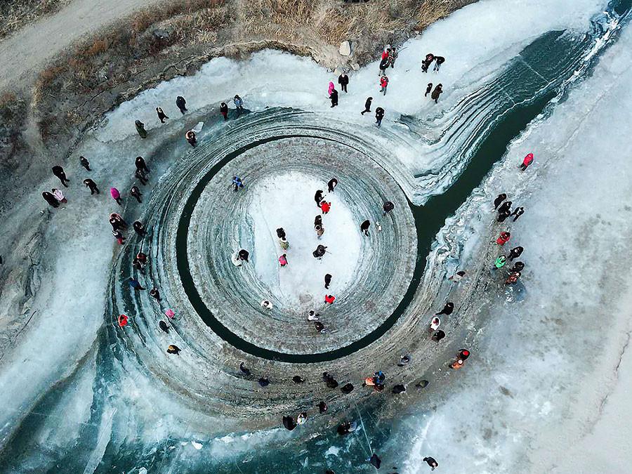 Các du khách tới thăm quan vòng tròn đóng băng trên sông Liêu Hà, Pháp Khố, Liêu Ninh, Trung Quốc.