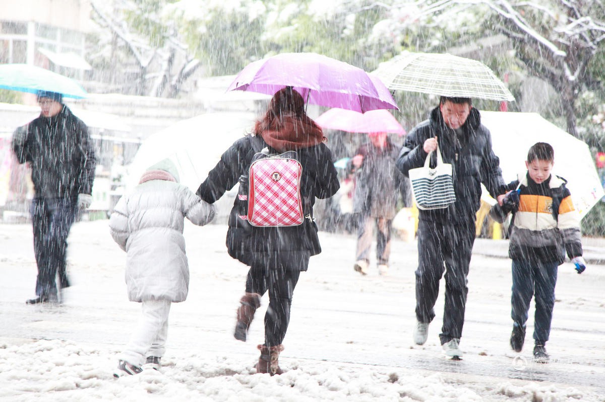 Học sinh tại Nam Kinh, Trung Quốc được bố mẹ đưa tới trường trong mưa tuyết.