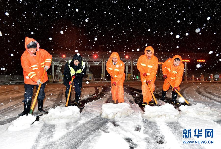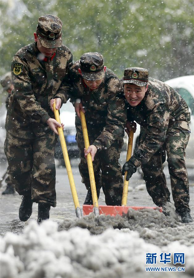 Bộ đội biên phòng đang dọn tuyết tại thị xã Hải Môn, Nam Thông, Giang Tô.