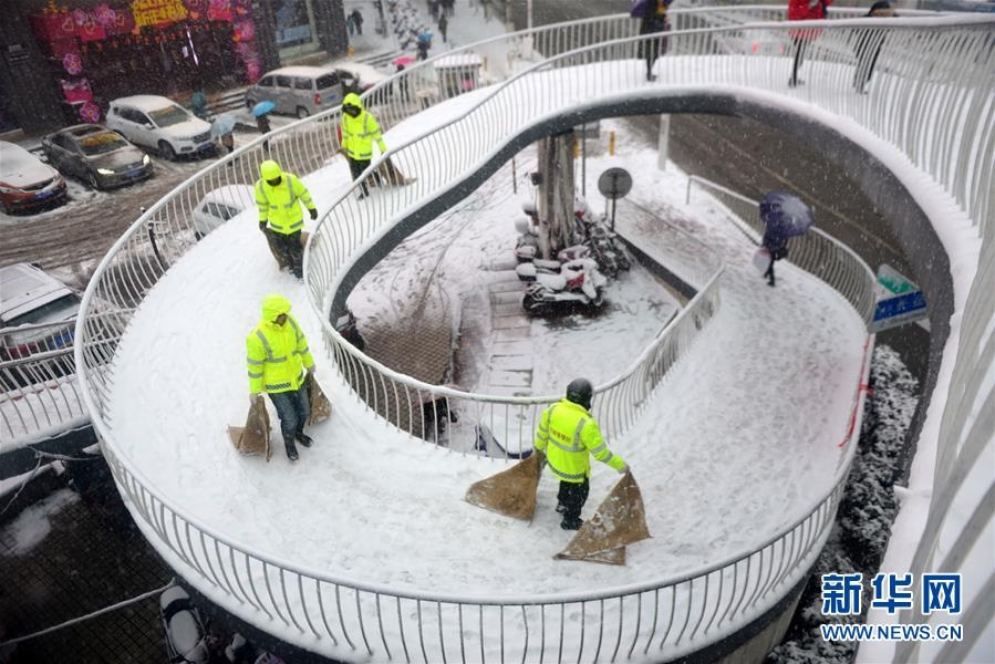 Các nhân viên tại Dương Châu, Giang Tô đang dọn tuyết vào sáng sớm.
