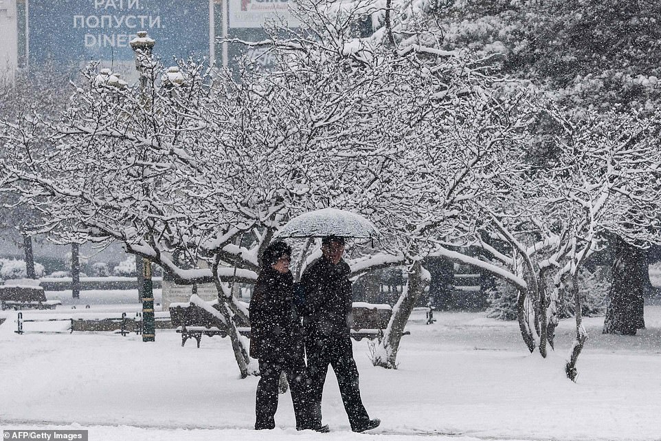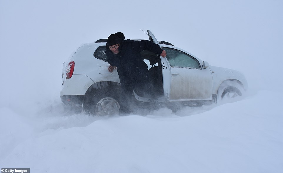 Một người đàn ông bước ra khỏi xe ô tô bị mắc kẹt giữa đường tại Kars, Thổ Nhĩ Kỳ. Đợt rét lần này bao phủ châu Âu, hướng về phía Địa Trung Hải.